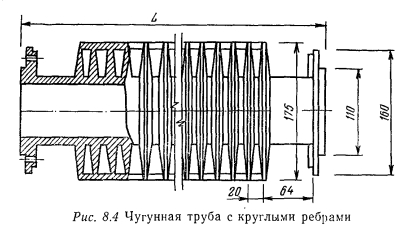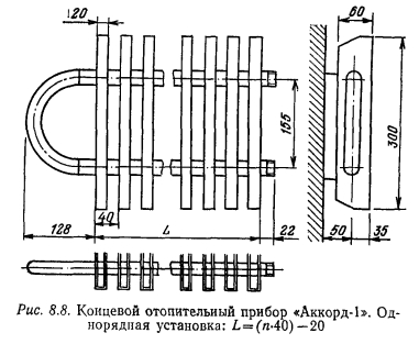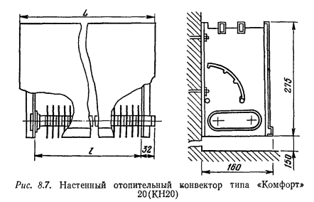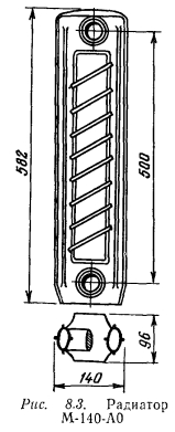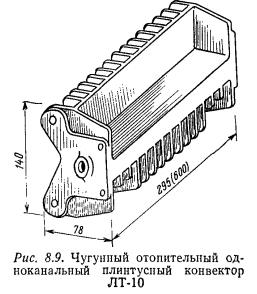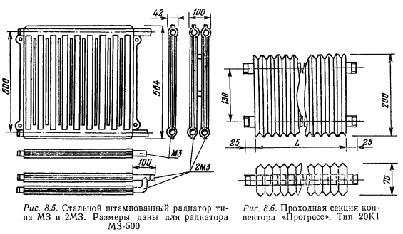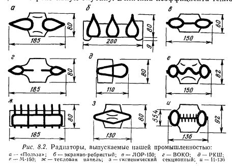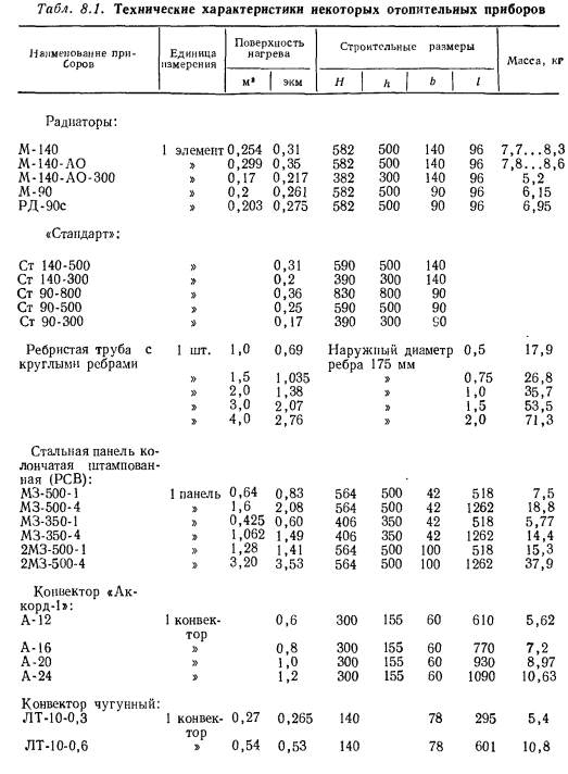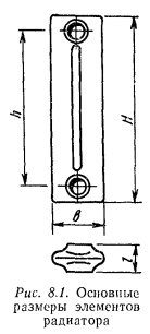 ВИДЫ ОТОПИТЕЛЬНЫХ ПРИБОРОВВыпускаемые в нашей стране отопительные приборы можно классифицировать по следующим признакам: а) по материалу — чугунные, стальные, бетонные; б) по конструктивным особенностям — высокие, средние, низкие, собираемые из отдельных элементов (одно-, двух- и многоканальные), блочные (двух- и многоэлементные), ребристые, гладкие с кожухом и без кожуха, панельные (плоские и профилированные); в) по способу теплоотдачи — конвективные, радиационные и конвективно-радиационные. Конвективные приборы или конвекторы передают тепло в основном путем естественной или вынужденной конвекции, лучистая теплоотдача их составляет не более 10 %; радиационными приборами являются плоские панели, у которых преобладает теплоотдача излучением; конвективно-радиационные приборы являются наиболее распространенными и передают тепло как конвективным, так и радиационным путем — теплообменная поверхность этих приборов весьма разнообразна и зачастую геометрически сложна; г) по теплоотдаче прибора с единицы его длины; по этому признаку отопительные приборы разделяют на три группы — низкой, средней и большой теплоотдачи. Повышение теплоотдачи с единицы длины достигается оребрением или профилированием греющих поверхностей и многорядной установкой. Длительное время единицей измерения греющей площади являлся квадратный метр. Эта величина, показывающая фактическую поверхность теплоотдачи отопительного прибора, не отражала полностью его теплотехнических качеств и не стимулировала поисков более совершенных и экономичных конструкций отопительных приборов. С 1957 года в целях более правильной технико-экономической оценки и стимулирования производства более совершенных конструкций отопительных приборов, дающих максимальный тепловой эффект и экономию металла, Госстроем СССР была введена новая единица измерения греющей площади — эквивалентный квадратный метр (экм). Эквивалентным квадратным метром называют такую условную греющую площадь отопительного прибора, через которую при разности средней температуры теплоносителя в приборе и окружающего воздуха 64,5 °С и при подаче теплоносителя в количестве 17,4 кг/ч в открыто установленный у стены прибор по схеме сверху— вниз рбеспечивается тепловой поток, равный 506 Вт. При определении теплоотдачи новых конструкций приборов теплоотдающая площадь их, подлежащая испытанию, должна составлять около 2 экм. ![]() Наиболее распространенными в настоящее время являются чугунные отопительные приборы, требуемую греющую площадь которых собирают из отдельных одно-, двух- или многоколонных элементов. Материалом для изготовления элементов таких приборов является серый чугун. Сборку элементов производят с помощью специальных ниппелей из ковкового чугуна, имеющих правую и левую наружную трубную резьбу. При теплоносителе с температурой до 100 °С уплотнителем при сборке элементов являются прокладки из термостойкой резины или из тряпичного картона, смоченного в воде и проваренного в натуральной олифе, а при параметрах теплоносителя более 100 °С применяют прокладки из термостойких материалов — паронита или клингерита. Характерными размерами элементов чугунных радиаторов являются: строительная или монтажная высота (расстояние между центрами ниппельных отверстий) — h, полная высота — Я, строите