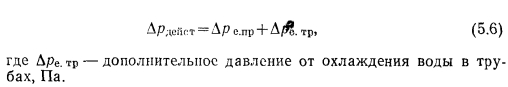 ВЛИЯНИЕ ОХЛАЖДЕНИЯ ВОДЫ В ТЕПЛОПРОВОДАХ НА ЕСТЕСТВЕННОЕ ДАВЛЕНИЕПри выводе формул для определения естественного давления сделано допущение, что горячая вода, двигаясь по теплопроводам системы, не охлаждается. В действительности она охлаждается, отдавая тепло в окружающую среду. Понижение температуры охлаждающейся в трубах воды и связанное с этим увеличение ее плотности неизбежно приводит к изменению естественного давления. С этим явлением приходится считаться при расчетах. Для определения естественного давления с учетом охлаждения воды в трубах необходимо знать ее фактическую температуру в характерных узловых точках или среднюю температуру воды на участках. Эти данные могут быть получены только после выполнения теплового расчета теплопроводов. Однако для каждого случая проведение такого расчета является достаточно сложной задачей, так как должны быть известны диаметр труб и условия их прокладки, в то время как для определения диаметров теплопроводов нужно знать величину естественного давления. Тепловой расчет в таких случаях производится только для систем квартирного отопления (см. гл. 10), а для практики пользуются данными ранее проведенных расчетов, которые систематизированы в таблицах и дают уже готовую величину добавочного давления от охлаждения воды в зависимости от этажности здания и протяженности системы (см. приложение IV). Дополнительное давление от охлаждения воды в трубах учитывается всегда только в системах с верхней разводкой при естественной циркуляции. Для систем с нижней разводкой практически допустимо не учитывать давление, возникающее от охлаждения воды в трубах вследствие незначительной его величины. В системах с искусственной циркуляцией теплоносителя из-за перемещения по теплопроводам большого количества воды с большими скоростями понижение температуры воды оказывается сравнительно малым и поэтому становится малым добавочное давление от охлаждения воды в трубах. Таким образом, для систем с естественной циркуляцией теплоносителя величину действующей в системе разности давлений всегда следует определять по выражению ![]() |