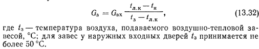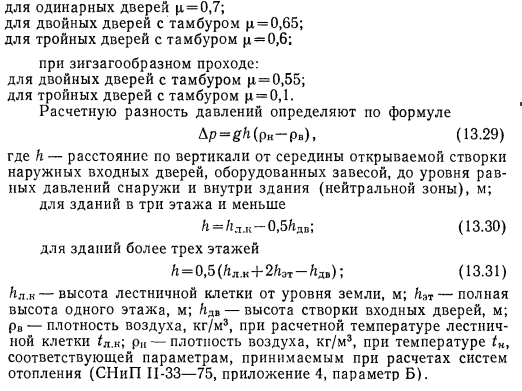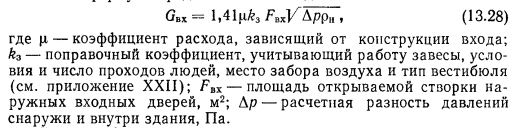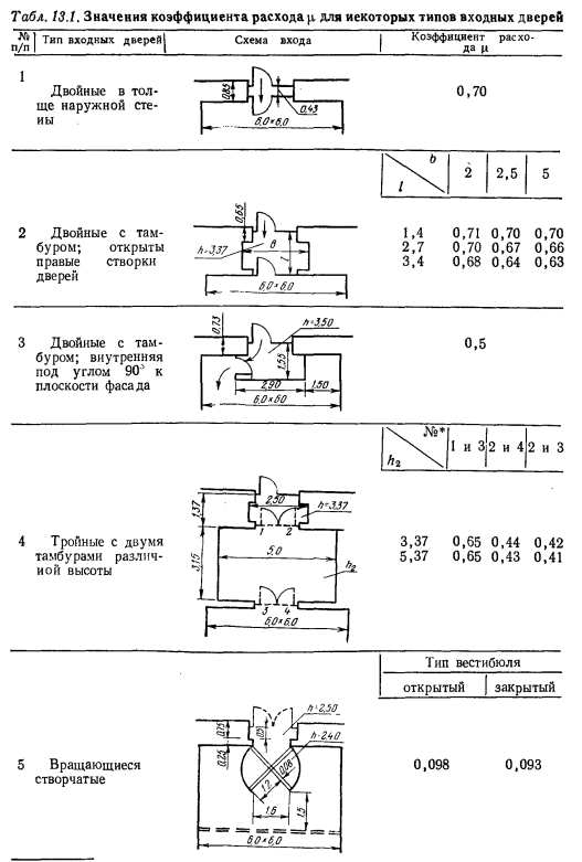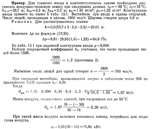 ВОЗДУШНО-ТЕПЛОВЫЕ ЗАВЕСЫ У НАРУЖНЫХ ВХОДОВ ЗДАНИЙВ многоэтажных общественных зданиях при большом количестве посетителей входные двери длительное время находятся в открытом состоянии и через них в здание поступает холодный воздух. В помещениях, расположенных непосредственно у входных дверей,— в вестибюлях, гардеробных — наблюдается снижение температуры внутреннего воздуха. Тамбуры, шлюзы, вращающиеся двери способствуют уменьшению количества врывающегося холодного воздуха, однако и эти устройства не устраняют полностью поступлений холодного воздуха. При сравнительно редком открывании дверей для возмещения потерь тепла на нагрев холодного воздуха достаточны те надбавки, которые учитывают при расчете теплопотерь. Когда же входные двери находятся открытыми длительное время — более 5 мин в час, приходится прибегать к специальным устройствам, частично препятствующим поступлению холодного воздуха в здание. Такими устройствами являются воздушно-тепловые завесы, устраиваемые у входов в здания. Воздушно-тепловая завеса у входов создается специальной рециркуляционной установкой, состоящей из воздуховодов, вентилятора и калориферов. В этой установке воздуху, забираемому снаружи или внутри здания, в калориферах сообщается такое количество тепла, которое необходимо для подогрева поступающего холодного воздуха. Нагретый воздух подается в вестибюль или непосредственно в тамбур, вследствие чего там создается некоторое повышенное давление (подпор), препятствующее врыванию наружного воздуха. Поступающий частично холодный воздух, перемешиваясь с воздухом завесы, подогревается и, поступая в вестибюль, не переохлаждает его. Воздушно-тепловые завесы смесительного типа применяют при расчетной температуре наружного воздуха для проектирования отопления от —15 до — 25 °С и при проходе через двери в течение одного часа более 400 чел.; при температуре от —26 до — 45 °С и при проходе более 250 чел.; при температуре ниже — 45 °С и проходе более 100 чел. Воздушно-тепловые завесы предусматривают также во входах в помещения, оборудованные системами кондиционирования воздуха и в помещения со значительными выделениями влаги или с близкими к входам рабочими местами. Рассматриваемый ниже метод расчета воздушно-тепловых завес, основанный на работах А. Н. Сканави, применяют для зданий более трех этажей при сбалансированной приточно-вытяжной механической вентиляции, когда поступление холодного воздуха через открывающиеся створки дверей происходит только благодаря разности давлений по обе стороны этих дверей. Если допустить, что разность статических давлений, образующаяся вследствие различия плотностей внутреннего и наружного воздуха при открывании дверей, затрачивается на создание динамического давления входящего в проем наружного воздуха и учесть неизбежное сжатие струи, которое обычно учитывается коэффициентом расхода р, а также ввести некоторую поправку на продолжительность нахождения дверей в открытом состоянии, то получим формулу для определения секундной массы наружного воздуха Gвх, поступающего через открытые створки дверей. ![]() В табл. 13.1 приводятся значения р для некоторых конструкций входов. При отсутствии данных по другим конструкциям входов можно пользоваться следующими ориентировочными значениями р. При прямом пр