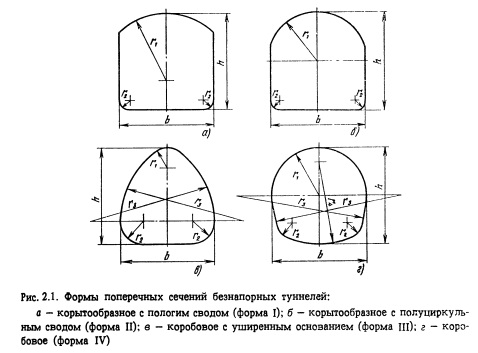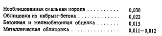 Гидравлический расчет туннеля при установившемся или неустановившемся режиме определяет пропускную способность туннеля и экстремальные гидростатические нагрузки на обделку туннеля. Расчетные схемы представлены на рис. 2.4. Гидравлические расчеты установившегося режима излагаются в ряде курсов гидравлики и справочниках по гидравлическим расчетам. В настоящее время сооружаются необлицованные деривационные туннели или туннели с обделкой из набрызг-бетона. Ниже приводятся коэффициенты шероховатости для деривационных туннелей: