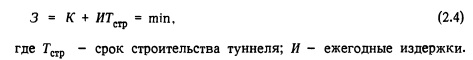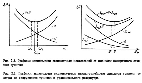 На рис. 2.2 показаны зависимости суммы затрат 3 и стоимости потерянной энергии от поперечного сечения ы деривационного туннеля. Как видно из рисунка, кривая суммы 3 + П в зоне минимума является пологой. При выборе оптимального значения ы необходимо учитывать другие качественные показатели, в том числе условия производства работ, параметры проходческого оборудования, или выбирать наименьшее значение ы. Исходные данные при расчете по стоимости работ и электроэнергии являются условно точными, поэтому возможно отступление от полученного значения поперечного сечения туннеля. Желательно также учитывать влияние размера поперечного сечения туннеля на другие сооружения (уравнительные резервуары, турбинные водоводы, основное оборудование) и условия регулирования нагрузки на ГЭС. В этом случае расчет делается в несколько этапов. На рис. 2.3 показано влияние затрат по сооружению туннеля Зтун и уравнительного резервуара на значение его экономически наивыгоднейшего диаметра. Как видно, при таком расчете оптимум будет смещаться вправо по сравнению с расчетом без учета уравнительного резервура.