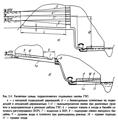 Основы энергоэкономических и гидравлических расчетовПодводящие и отводящие деривационные туннели могут выполняться как напорными, так и безнапорными. Выбор того или иного типа определяется характером колебаний уровней воды. Существенную роль играют также инженерно-геологические и топографические условия. Так, подводящий туннель, расположенный в глубине крепкого скального массива, должен быть выполнен напорным, а туннель, расположенный близко к поверхности и требующий более простых строительных подходов к нему, может быть безнапорным. При большом заглублении машинного зала для обеспечения нормальной работы турбин отводящая деривация выполняется напорной даже при незначительных колебаниях уровня воды в нижнем бьефе. Выбор того или иного типа деривационного туннеля, форм его поперечного сечения и размеров производится на основе энергоэкономических гидравлических и прочностных расчетов. Иногда форма и конструкция могут меняться по длине туннеля в зависимости от инженерно-геологических условий. Последними исследованиями и опытом эксплуатации доказана возможность работы туннеля в переменном гидравлическом режиме при условии обеспечения плавного перехода от одного режима к другому.