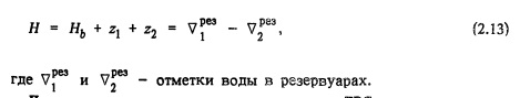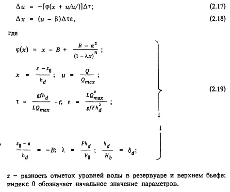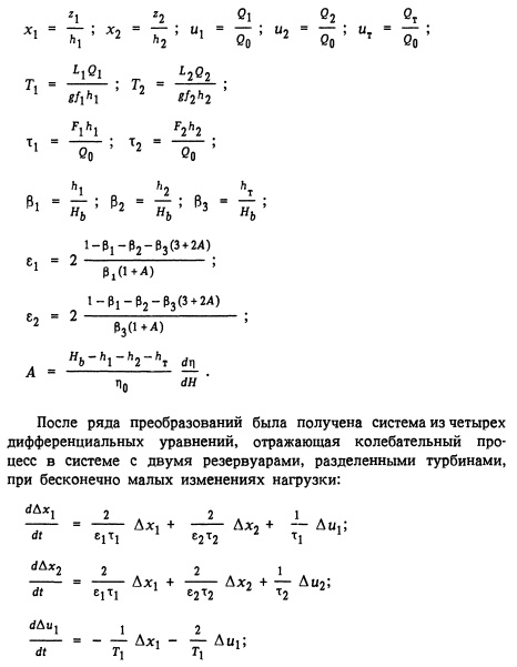 Площадь уравнительного резервуара должна превышать площадь, определяемую условиями гидравлической устойчивости и недопущения безнапорного режима в деривационном туннеле. Как правило, при незначительном заглублении выходного отверстия отводящего туннеля под уровень нижнего бьефа площадь, определяемая по последнему условию, больше, чем требуемая по условию гидравлической устойчивости. При расчете необходимо также учитывать, зависит или практически не зависит уровень воды в нижнем бьефе от расхода гидроэлектростанции. Гидравлическую устойчивость системы двух уравнительных резервуаров, разделенных турбиной, обеспечить сложнее, чем устойчивость одного резервуара, так как в них возникают колебания обратного характера, что способствует разгону колебаний. Для системы двух уравнительных резервуаров основные уравнения неустановившегося движения, неразрывности, формула напора турбины и условие постоянства мощности приняты с учетом следующих соотношений: ![]()