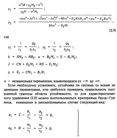 Для решения характеристического уравнения (2.8) можно воспользоваться критериями Рауса-Гурвица (а также критериями Михайлова, амплитудно-фазовым и др.). Для системы с одним неизвестным параметром это дает возможность получить зависимость этого параметра от характеристики системы, определяющей гидравлическую устойчивость. В случае же нескольких неизвестных пара- метров задача решается постепенным приближением. В практике проектирования ГЭС первоначальный выбор площадей сечений уравнительных резервуаров производится исходя из Условий устойчивости режимов при бесконечно малых изменениях Нагрузки. Затем размеры уравнительных резервуаров уточняются расчетом колебаний нагрузки, т.е. строится граница области устойчивости. Если находить уравнение границы на основе критериев Рауса-Гурвица, то необходимо решение сложных и громоздких выражений. Значительное облегчение в рассматриваемом случае дало использование D-разбиения пространства коэффициентов характеристического уравнения и пространства параметров, применяемого для исследования устойчивости автоматических систем. Методом D-разбиения получено уравнение границы области устойчивости в параметрической форме: ![]() ![]()