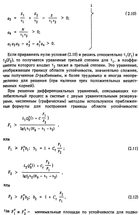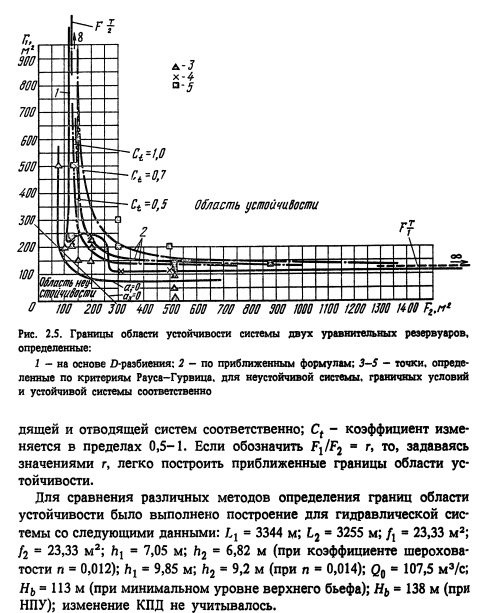 Область устойчивости в координатах Fj и F2, построенная на основе D-разбиения, кривые, определенные по приближенным формулам, а также проверочные точки по критериям устойчивости представлены на рис. 2.5. На основе математического анализа установлено, что приближенные формулы дают неточные значения F1, F2. При значениях, равных или близких к единице, площади, определенные по формулам (2.10)и (2.11), могут дать неустойчивую систему. При других значениях г они получаются с излишним запасом. Причем точная граница области устойчивости при различных параметрах системы имеет разный характер, поэтому заранее определить, в каких случаях приближенные формулы дают заниженные значения, не представляется возможным. Поэтому приближенными формулами рекомендуется пользоваться только при эскизном проектировании. Коэффициент Ct = 1 следует брать для системы с одинаковыми параметрами подводящей и отводящей дериваций, так как такая система наиболее неблагоприятна по условиям устойчивости. Чем более различны параметры дериваций, тем следует выбирать меньшие значения Cv При детальном проектировании необходимо выделить по предложенному методу точную границу области устойчивости. Расчет устойчивости при изменениях нагрузки ввиду сложности аналитического решения рекомендуется производи гь графоаналитическим способом с использованием ЭВМ. При наборе или частичном сбросе нагрузки колебания горизонта воды в резервуарах подводящей и отводящей дериваций оказывают взаимное влияние. В этом случае расчет устойчивости необходимо выполнять с учетом постоянства мощности, устанавливающейся после изменения нагрузки. Напор ГЭС, действующий в данный момент при неустановившемся режиме, можно находить по формуле