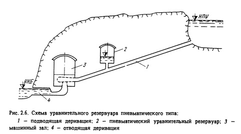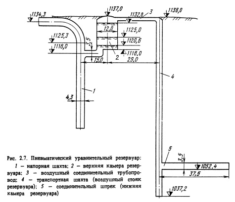Подземные уравнительные резервуары ГЭС пневматачеекого типа отличаются тем, что в них колебания воды происходят в закрытой камере при давлении воздуха, превышающем атмосферное (рис. 2.6) [13]. Благодаря повышенному давлению воздуха амплитуда колебаний воды при изменениях нагрузки на ГЭС значительно сокращается, что значительно снижает необходимую высоту резервуара. В деривационных ГЭС с напорной деривацией уравнительные Резервуары обычных типов, сообщающиеся с атмосферой, в ряде случаев имеют значительную высоту и их не удается расположить под землей. Применение многокамерных уравнительных резервуаров или резервуаров с сопротивлением не дает, как правило, желаемого результата. В этих случаях может быть применен резервуар пневматического типа.