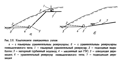 При использовании для сооружения туннеля проходческих комбайнов круговая форма поперечного сечения применяется для напорных и безнапорных деривационных туннелей ГЭС. Основы гидравлического расчета туннельных дериваций. Гидравлический расчет ведется не отдельно для каждого сооружения, а для системы сооружений: при головной компоновке турбинные водоводы - турбина - отводящая деривация; при концевой деривационный туннель - напорный бассейн (уравнительный резервуар) - турбинный водовод - турбина; при промежуточной подводящий деривационный туннель - верховой уравнительный резервуар - турбинный водовод - турбина - низовой уравнительный резервуар (расширительный бассейн, переходный участок) - отводящий деривационный туннель.