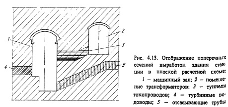 Основы статических и динамических расчетовОдним из наиболее характерных факторов, существенно усложняющих задачу расчета и проектирования рассматриваемых сооружений, являются их большие габариты наряду с относительной близостью расположения смежных выработок. Первое обстоятельство обуславливает необходимость поярусной разработки пространства камер и их крепления, второе - практически исключает возможность их рассмотрения как одиночных выработок. Важным следствием больших габаритов выработок является значительное увеличение по сравнению с туннелями глубины зоны разуплотнения массива. Именно этим объясняется прежде всего существенное изменение характера взаимодействия элементов системы массив-крепь: уменьшается роль крепи в непосредственном восприятии нагрузки на указанную систему и, наоборот, возрастает ее консолидирующее влияние на структурные элементы массива в зоне разуплотнения. Иначе говоря, НДС сооружений определяется главным образом физико-механическими и структурными параметрами массива. По этой причине при их математическом моделировании акцент (по сравнению с туннельными выработками) переносится с крепи на массив, что обуславливает определяющую роль Метода механики сплошных и дискретных сред. В связи с изложенным выше существенно возрастает значение Фактора технологии строительства. Напряженное состояние конструкций крепей выработок в значительной мере определяется последовательностью строительных работ. Моделирование этой последовательности при расчетных исследованиях приводит к необходимости рассмотрения сложных многоэтапных СНРС таких сооружений. Следующая важная особенность рассматриваемых строительных объектов заключается в том, что комплекс взаимосвязанных камерных и туннельных выработок, входящих в состав основных со- оружений подземного машинного зала ГЭС, в строгой постановке определяет сугубо пространственный характер задачи их расчета. Однако на сегодня достаточно корректная реализация подобной постановки в подавляющем большинстве практических случаев нереальна и, как правило, нецелесообразна в силу ряда существенных причин: низкий уровень достоверности инженерно-геологического описания грунтового массива; слабое развитие и техническое оснащение промышленных методик полевых изысканий; сложность описания в трехмерных расчетных схемах макроструктуры массива, конфигурации подземных выработок и технологической последовательности их проходки и крепления. В силу указанных причин расчетные исследования реальных объектов выполняются в настоящее время, как правило, на базе плоских моделей. В известной степени такой подход оправдан протяженным характером самих камерных выработок - машинных залов и помещений трансформаторов. В результате задача их расчета, так же как и для туннелей, сводится к последовательному рассмотрению характерных поперечных сечений. При этом ослабление массива регулярной системой поперечных туннельных выработок (подводящих и отводящих водоводов и др.) учитывается в плоской расчетной схеме путем понижения значений характеристик его свойств в пределах площади их проекций на рассматриваемое сечение (рис. 4.13).