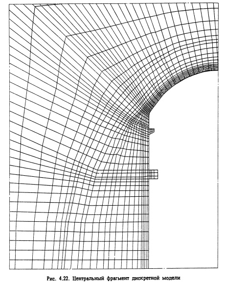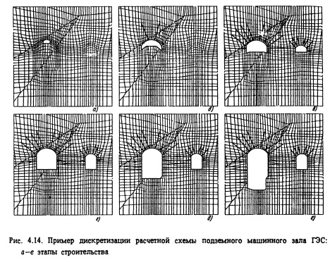На рис. 4.14 приведен пример дискретной модели СНРС подземного машинного зала ГЭС. Задачи стационарной напорной фильтрации и теплопроводности. Указанные задачи для рассматриваемых подземных сооружений чрезвычайно актуальны. Фильтрационные воздействия на них являются скорее правилом, нежели исключением. В большинстве случаев выработки проходятся и эксплуатируются в обводненных массивах. Изменение теплового режима вокруг выработок, располагаемых в вечномерзлых массивах, - определяющий фактор характера и интенсивности проявления горного давления на конструкции крепей в этих условиях. Как и в задачах статики, здесь в общем случае также необходимо моделировать в расчетных схемах характерные этапы строительства сооружения, т.е. рассматривать их как структурно-нелинейные системы.