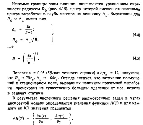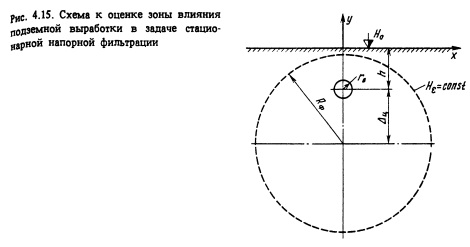 Основной целью решения рассматриваемых задач является определение дополнительных нагрузок на подземные сооружения в процессе их строительства и эксплуатации, обусловленных гидродинамическим и гидростатическим воздействиями подземных вод, изменением температурного поля вокруг выработок. Вследствие больших габаритов рассматриваемых камерных выработок снижение указанных воздействий на них является чрезвычайно важной задачей, решаемой с помощью специальных инженерных систем (дренажных, холодильных). Для оценки эффективности работы этих систем и определения на этой основе их рациональных параметров необходимо моделировать такие элементы в расчетных схемах сооружений. В математической постановке это означает необходимость учета в разрешающих соотношениях соответствующих краевых задач не только регулярных, но и дискретных членов, описывающих разрывной характер области и наличие в ней сингулярных факторов. Расчетные параметры в плоской задаче задаются приведенными на единицу длины выработки в направлении, нормальном расчетному сечению, т.е. параметры соответствующих конструктивных элементов (дрен, тепловодов) делятся на шаг их установки в указанном направлении. Для назначения границ расчетной области при численной реализации задач необходимо иметь оценку размеров зоны влияния выработок в стационарном поле. Приближенную оценку можно получить из рассмотрения единичной круговой выработки радиусом гв, расположенной на глубине h от дневной поверхности, на которой задано значение напора (рис. 4.15).