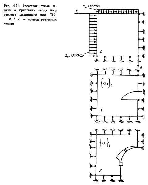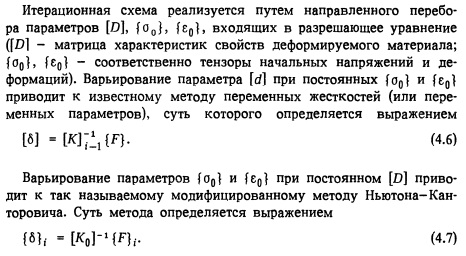 Решение физически нелинейных задач. Решения, получаемые на базе описанных выше линейно-упругих схем применительно к камерным выработкам, можно рассматривать лишь как начальное приближение. Количественное выражение таких сложных геологических явлений в грунтовом массиве, как пластичность, ползучесть и другие, для крупногабаритных выработок весьма существенно, поэтому нормы [21] определяют необходимость выполнения расчетов при оценке НДС на заключительных стадиях проектирования только на основе физически нелинейных моделей. Вместе с тем при обеспечении своевременного крепления раскрываемых участков выработок перемещения точек массива скальных грунтов остаются обычно достаточно малыми, чтобы можно было пренебречь нелинейностью связи между ними и деформациями и рассматривать задачу как геометрически линейную. В такой постановке нелинейную зависимость между напряжениями и деформациями можно учесть на основе общих вариационных принципов. Решение таких задач, называемых физически нелинейными, строится в виде итерационной схемы, где нулевым приближением является упругое решение.