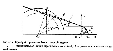 Важным вопросом при численной реализации критерия Мора является аппроксимация линии (рис. 4.16, поз. 1), ограничивающей область предельных состояний - огибающей предельных кругов Мора. Во многих работах данная линия аппроксимируется прямой, определяемой зависимостью вида