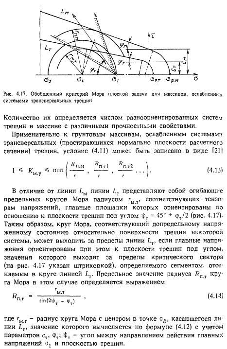 Входящий в условия (4.10), (4.11) коэффициент Киу характеризует степень близости Некоторой экстремальной точки (точка А, рис. 4.16) запредельного круга к линии предельных состояний. Условие (4.10) оценивает эту близость в направлении координатных линий; неравенство (4.11) соответствует минимальному значению поскольку исходит из оценки взаимного расположения запредельного круга г и линии предельных состояний критерия Мора. При реализации итерационной схемы метода упругих решений или метода начальных напряжений указанные критерии используются для анализа допустимости вычисленных на очередной гй итерации напряжений. При этом в точках, где Км у < 1, осуществляется коррекция тензора напряжений в соответствии с принятым способом преобразования запредельных кругов Мора до допустимых размеров. Разность значений начальных и преобразованных напряжений определяет значение вектора невязки в решении, который используется для вычисления грузового вектора следующей итерации. В классической форме критерий Мора позволяет рассматривать только изотропные среды. Г.Н. Кузнецовым была предложена обобщенная форма критерия Мора (рис. 4.17), позволяющая рассматривать грунтовые массивы, ослабленные разноориентированными системами трещин и напластований. Как видно из рисунка, обобщенный критерий помимо прочности массива в направлениях, не совпадающих с трещинами, определяемых линией LM, характеризует также прочностные свойства поверхностей трещин, область допустимых значений напряжений на площадках которых ограничивается линиями. Таких линий обобщенный критерий в принципе может включать несколько. ![]()