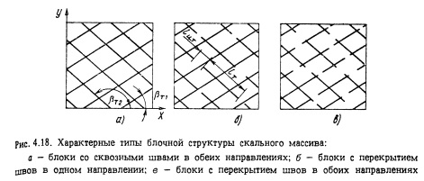 Модели, описанные выше, неявно предполагают непрерывность трещин. Такая предпосылка вполне корректна до тех пор, пока длина трещин превышает характерные размеры выработок. В противном случае прерывистую структуру трещин необходимо учитывать в расчетной модели. Нередко эту задачу решают путем вычисления приведенных прочностных характеристик квазинепрерывных трещин на основе способа континуализации (размывания) прочности целиков массива между ними. Такой подход вполне приемлем, если длина трещины существенно превышает размер целиков массива (рис. 4.18). Другой подход к решению данной задачи основан на анализе кинематической возможности реализации предельного относительно плоскости трещин напряженного состояния. В отличие от способа размывания прочностных свойств он является корректным в случаях, когда размеры трещин и целиков массива соизмеримы. Для иллюстрации этого подхода рассмотрим массив, ослабленный двумя системами трансверсальных трещин с углами наклона зависимости от геометрических параметров трещин при этом возможны три характерные модели блочного массива (рис. 4.18). При анализе напряженного состояния массива в итерационном процессе решения на базе указанных моделей нелинейных задач используется предположение о невозможности кинематической реализации в рассматриваемой точке запредельного (относительно поверхности прерывистой трещины одной из блокообразующих систем) напряженного состояния грунтового массива, если оно является при этом допустимым относительно поверхности трещин другой блокообразующей системы. Оценка устойчивости выработок и определение параметров их анкерной крепи. Оценка устойчивости выработок выполняется на базе расчетных схем предельного равновесия, составляемых для потенциально неустойчивых грунтовых блоков (вывалов в своде, стеновых призм обрушения грунта). Возможные наиболее неблагоприятные конфигурации таких блоков строятся с учетом структуры трещиноватости массива в пределах, найденных с помощью описанных выше физически нелинейных моделей механики сплошных сред зон развития неупругих деформаций (рис. 4.19).