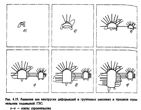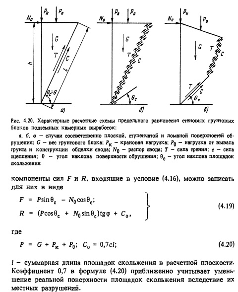 При рассмотрении наиболее широко распространенных в проектировании подземных ГЭС камерных выработок с корытообразной формой поперечного сечения оценка устойчивости в плоской постановке стеновых грунтовых блоков производится на базе расчетных схем, характерные типы которых изображены на рис. 4.20. Принимая в соответствии с [21] ус грунтовых блоков равным единице.