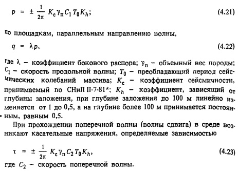 Длина анкеров определяется геометрией поверхности обрушения наиболее неблагоприятного в этом смысле неустойчивого стенового грунтового блока. Общие положения расчета сейсмонапряженного состояния сооружений. Сейсмическая нагрузка на подземные сооружения представляет собой деформационное воздействие, вызываемое прохождением в массиве продольных и поперечных волн, возникающих в очаге землетрясения, и характеризуется сейсмограммой (графиком изменения во времени смещений точек грунтового массива), велосиграммой (графиком изменения во времени скоростей смещения точек массива) акселерограммой (графиком изменения во времени ускорений смещения точек массива), а также направлением распространения сейсмических волн. Реальное сейсмическое воздействие носит весьма сложный, хаотический характер, поэтому при моделировании оно, как правило, схематизируется в виде суммы периодических колебаний (гармоник). Согласно гл.7 СНиП-Н-7-81 сейсмическую нагрузку при проектировании подземных сооружений следует учитывать лишь для районов, подверженных землетрясениям силой 7, 8, 9 баллов. В настоящее время существует два подхода к решению задачи о сейсмонапряженном состоянии подземных сооружений: расчеты в квазистатической постановке и методами волновой динамики. В основе квазистатического подхода лежит допущение о возможности пренебрежения изменением напряженного состояния массива, вызываемого сейсмическим воздействием, в пределах некоторой расчетной области, включающей выработку. Такой подход в целом ряде случаев вполне правомерен, так как длина сейсмических волн обычно на порядок превышает характерные размеры подземного сооружения и при этом распределение напряжений вокруг него аналогично статическому. Напряжения на границе расчетной области, вызванные сейсмической нагрузкой в виде продольной волны (волны сжатия - растяжения), определяются зависимостями, предложенными Ш.Г. Напетваридзе: по площадкам, перпендикулярным направлению волны, принимаемый по СНиПИ-7-81; Kh - коэффициент, зависящий от глубины заложения, при глубине заложения до 100 м линейно изменяется от 1 до 0,5, а на глубине более 100 м принимается постоянным, равным 0,5. Направление распространения волн вследствие неопределенности положения очага землетрясения, отражения их от свободной поверхности, многократного преломления и отражения от границ раздела слоев в массиве может быть любым по отношению к сооружению. Учесть эти факторы позволяет предложенная в ГЗО) методика, основанная на оценке наиболее неблагоприятного напряженного состояния в каждом сечении конструкции при различных сочетаниях совокупного действия волн разного характера любого направления в плоскости поперечного сечения сооружения. Таким образом, в квазистатической постановке задача определения сейсмонапряженного состояния подземного сооружения сводится к расчету невесомой области с выработкой на заданные на ее границах статические нагрузки, определяемые зависимостями (4.21) - (4.23). В отдельном случае особого сочетания нагрузок напряжения в элементах конструкций, вызываемые инерционными сейсмическими нагрузками от собственного веса, определяются по формуле