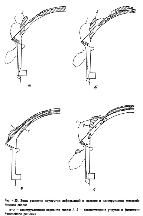 1) жесткая конструкция свода не в состоянии воспринять деформации кровли выработки, возникающие при разработке ее сечения: наблюдается ее разрушение в зонах пят и шелыги свода; 2) наличие податливой прослойки по всей поверхности контакта свода с массивом без устройства продольных деформационных швов лишь изменяет характер напряженного состояния конструкции, не обеспечивая ее несущую способность;