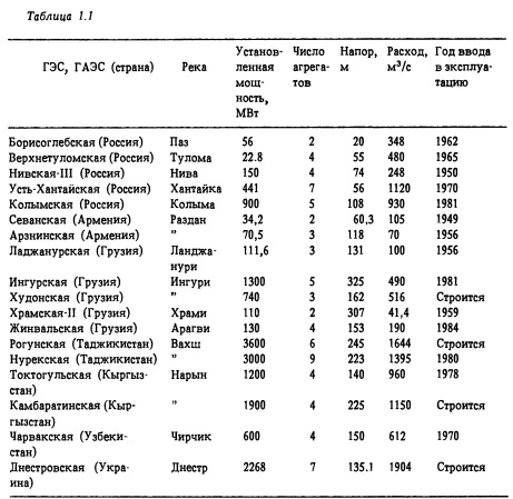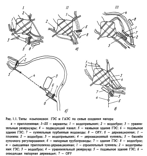 Подземные комплексы ГЭС и ГАЭСПодземные сооружения ГЭС и ГАЭС можно разделить по взаимодействию с водной средой на две основные группы: гидротехнические подземные сооружения, предназначенные для подвода воды к гидроагрегатам ГЭС и ГАЭС и ее отвода, сооружения для дренажа плотин и для отвода воды в период строительства гидроузлов; подземные выработки, в которых размещается основное и вспомогательное оборудование, необходимое для нормальной эксплуатации ГЭС и ГАЭС, а также выработки, предназначенные для транспортирования различных грузов, вентиляции, выполнения цементационных работ и др. Гидроэлектростанции по схеме создания напора разделяются на типы, приведенные на рис. 1.1. ГАЭС, в составе которых имеются подземные сооружения, можно разделить на две группы: ГАЭС с подземным машинным залом и в ряде случаев с подземным нижним бассейном; ГАЭС с подземными турбинными водоводами и наземным или полу- подземным машинным залом. Характеристики крупнейших построенных и строящихся подземных ГЭС и ГАЭС, а также ГЭС и ГАЭС, в состав которых входят подземные сооружения, представлены в табл. 1.1. В настоящее время построены крупнейшие комплексы подземных сооружений ГЭС и ГАЭС: Ингурская ГЭС (Грузия) смешанного типа с высокой плотиной и длинной деривацией; приплотин- ные крупнейшие ГЭС - Токтогульская с бетонной плотиной (Кыргызстан), Нурекская и Рогунская ГЭС с крупнейшими плотинами из местных материалов (Таджикистан), деривационная ГЭС Нечако-Кемано (Канада), Днестровская ГАЭС (Украина), ГАЭС Динорвик (Англия).