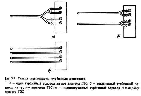 Принципы назначения размеров поперечного сечения турбинных водоводовЭнергоэкономический расчет размеров поперечных сечений турбинных водоводов, как и деривационных туннелей, основан на принципе ьяинимума суммы затрат по сооружению водовода и стоимости потерянной энергии. Такой принцип расчета позволяет учитывать изменение основной нагрузки - внутреннего давления по длине турбинного водовода. В шахтных (вертикальных) турбинных водоводах поперечное сечение принимается постоянным; такое решение диктуется производственными условиями. На горизонтальных или наклонных участках турбинного водовода сечение может приниматься переменным, постепенно уменьшающимся до перехода к спиральной камере. Сечение также меняется после развилок при переходе от общего для всей ГЭС или группы агрегатов ГЭС водовода к индивидуальным водоводам каждой турбины. Компоновку турбинных водоводов можно разделить на следующие группы: к каждому агрегату вода подводится по индивидуальному водоводу - головная схема компоновки ГЭС (рис. 3.1, в); применяется при большой мощности гидроагрегатов и соответственно большом расходе воды, а также на ГАЭС с относительно небольшим напором и небольшой длиной турбинных водоводов: один турбинный водовод на все агрегаты ГЭС с разветвлениями перед турбинами; применяется при большой длине водоводов, высоких напорах и соответственно малых расходах - концевая и промежуточная схема компоновки (рис. 3.1, а); один турбинный водовод на группу агрегатов с развилками для подвода воды к каждой турбине; применяется при большом числе агрегатов, большой длине турбинных водоводов в концевой и промежуточной схемах компоновок, реже в головной схеме (рис. 3.1, б).