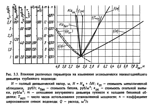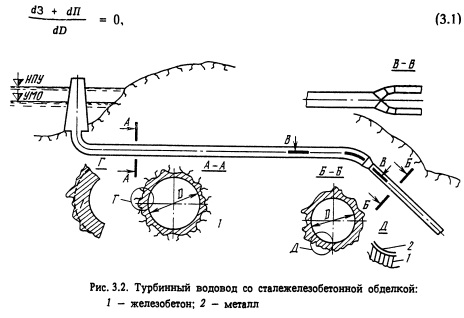 Обычно турбинные подземные водоводы проектируются с комбинированной обделкой металл-бетон-скала, причем скала должна воспринимать значительную часть нагрузки. Для такого водовода ГЭС или ГАЭС можно составить аналитическую зависимость расчетных затрат, стоимости потерянной энергии от напора и диаметра трубопровода. Приравняв к нулю первую производную: получим значение экономически наивыгоднейшего диаметра, которое определяет минимум суммы.