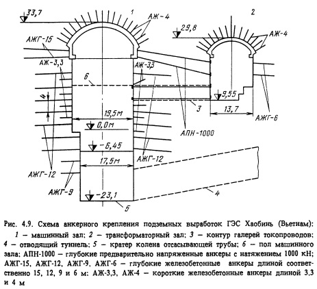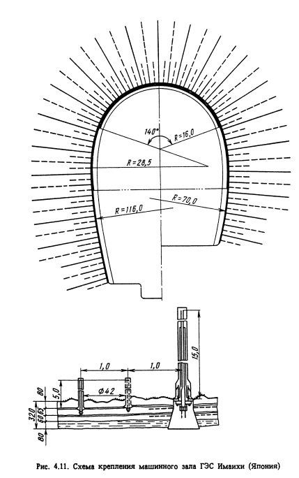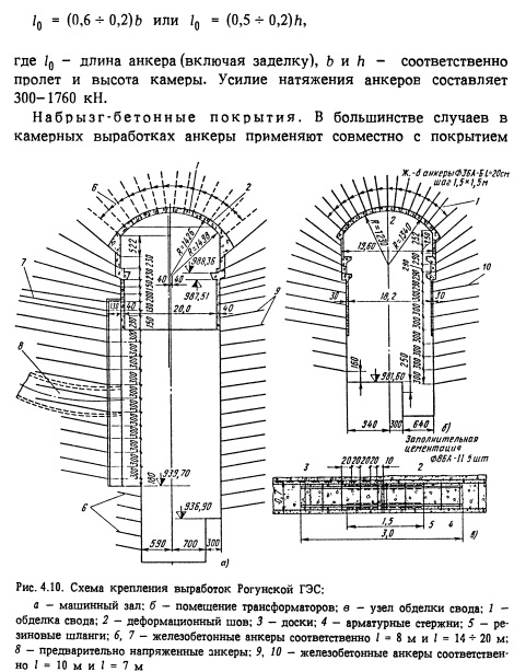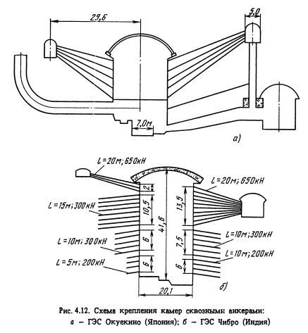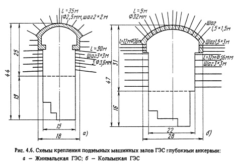 В подземных машинных залах ГЭС и ГАЭС применяют анкеры длиной 10-20 м с шагом от 3 до 4 м по высоте камеры и от 3 до 6 м по длине камеры. ![]() ![]()