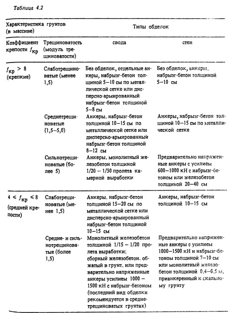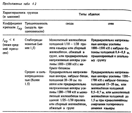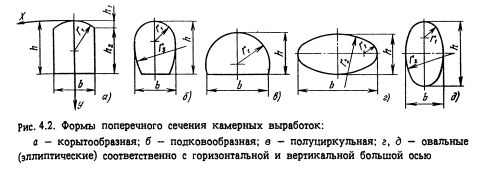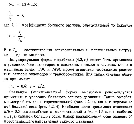 Рекомендуемые формы крупных камерных выработок показаны на рис. 4.2. Выбирать их следует в зависимости от назначения сооружения (машинный зал, трансформаторное помещение, камеры затворов и др.) и габаритов технологического оборудования с учетом инженерно-геологической обстановки и технологии строительных работ. ![]()