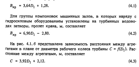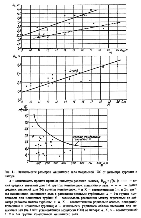 Принципы определения размеров подземных машинных залов, трансформаторных помещений и помещений затворовВ § 1.2 рассмотрена классификация компоновок станционных узлов подземных ГЭС. Размеры помещений определяют размеры устанавливаемого в них оборудования, условия их эксплуатации и строительства. Размеры подземных помещений зависят также от компоновки основного оборудования, расположения подходов к подземным помещениям. Зависимость основных размеров машинного зала от диаметра рабочего колеса турбины дает возможность установить приближенные значения пролета выработки машинного зала, пролета крана Вкр и расстояния между агрегатами С. На рис. 4.1 представлены данные по построенным ГЭС и приведены средние (оптимальные) значения этих параметров. На рис. 4.1, а приводится зависимость пролета крана подземного машинного зала от диаметра рабочего колеса турбины. Для группы компоновок машинных залов, в которых установлено только гидросиловое оборудование, пролет крана, м, вычисляется по следующей формуле:
