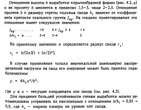 Выбор формы поперечного сечения камерной выработки следует производить на основании расчетов путем сравнения вариантов. Должна приниматься та форма, которая обеспечивает наибольшую сохранность массива и минимальную материалоемкость конструкции. Камерные выработки без несущих обделок. Возможность оставления камерной выработки без обделки должна быть оценена на основе анализа инженерно-геологических условий и подтверждена расчетом и исследованием на физических моделях. Глубина заложения кровли выработки, оставляемой без обделки, должна быть не менее двух пролетов этой выработки. В выработках, оставляемых без обделок, в которых располагается технологическое оборудование, следует предусматривать устройство подвесных потолков и декоративных стен, которые одновременно могут служить элементами дренажной и вентиляционной систем. Места пересечения камерных выработок, оставляемых без обделок, с туннелями, штольнями и другими выработками, а также локальные ослабления грунтового массива следует закреплять несущими конструкциями.