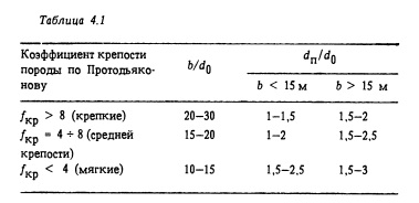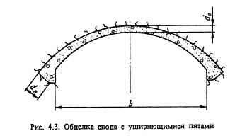 Основными типами обделок камерных выработок являются: железобетонная обделка свода и стен в сочетании с обычными анкерами различной длины; железобетонная обделка свода и набрызг-бетонная обделка стен (иногда и свода) в сочетании с предварительно напряженными анкерами. Обделки из железобетона и обычных анкеров. Обделка свода. Характерная обделка свода представляет собой сплошную конструкцию из монолитного железобетона (в отдельных случаях - из бетона) с уширяющимися пятами, которые заглубляются в породу (рис. 4.3). Подобный свод рассчитывается как бесшарнирная арка с пятами, упруго защемленными в породу. На основании практических данных предварительно параметры свода можно определить по табл. 4.1. Например, в подземной ГАЭС Маркерсбах (ФРГ) машинный зал находится в крепких изверженных породах. При пролете зала 24 м принят железобетонный свод толщиной в замке 0,8 м, в пятах dn = 1,5 м. Для выработок с пролетом 15 м и с криволинейными стенами обделки в мягких породах верхний предел отношения возрастает до 20, а в породах средней крепости нижний предел уменьшайся до 12.