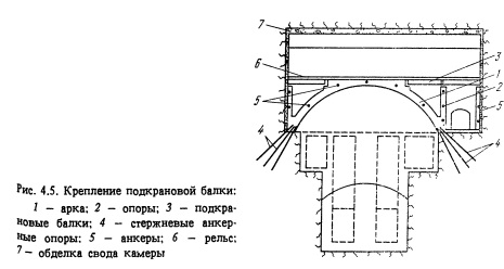 Если в мягких породах при пролетах 15 м распор свода целиком передается на стенки, то нижний предел отношения может быть снижен до единицы. Такое же положение имеет место для пород средней крепости и крепких при пролетах 15 м. В состав обделки включается обычно анкерная крепь и набрызг-бетон по сетке, которые используются в качестве временных конструкций в процессе строительства камеры. В особо прочных массивных породах ограничиваются этой крепью и не возводят бетонного свода, как это имело место в машинном зале Верхне-Туломской ГЭС. В большинстве случаев такое решение применяют пока для камерных выработок вспомогательного назначения, в которых при эксплуатации не находятся люди (уравнительных резервуаров и т.п.). Можно отказаться от применения колонн под подкрановые балки за счет использования подвесных опор, в которых подкрановые балки омоноличены со сводом (рис. 4.4). Аналогичная конструкция свода применена в машинных залах Ингурской, Жинвальской, Хоабиньской ГЭС. Конструкция эта, несмотря на ее очевидную эффективность, достаточно сложна: трудно обеспечить качественные монолитные стыки соединения опор со сводом, образуемого на уровне горизонта разработки верхней части камеры; сложно сохранить целик породы под опорами. Указанные недостатки ограничивают область применения подвесных опор. Наиболее прогрессивным решением является переход на прианкерные опоры. В этом случае опоры устанавливают на пород ную полку и прианкеривают их. Ташгидропроектом разработано оригинальное крепление железобетонной подкрановой балки, расположенной на скальном усту пе стены камерной выработки также без применения подкрановых колонн. Балка своей боковой гранью скреплена со скальной стенкой несущими стальными анкерами, заделанными веерообразно в горный массив. Концы анкеров в пределах балки объединены арматурным каркасом. Снизу железобетонные балки омоноличены с выравнивающей слабоармированной обделкой стен камерной выработки (рис. 4.5).