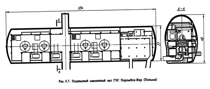 Важным показателем экономичности подземного машинного зала является удельный объем (на 1 кВт установленной мощности ГЭС). На рис. 4.1, в представлена зависимость удельного объема выломки w, м3/кВт, от расчетного напора ГЭС.