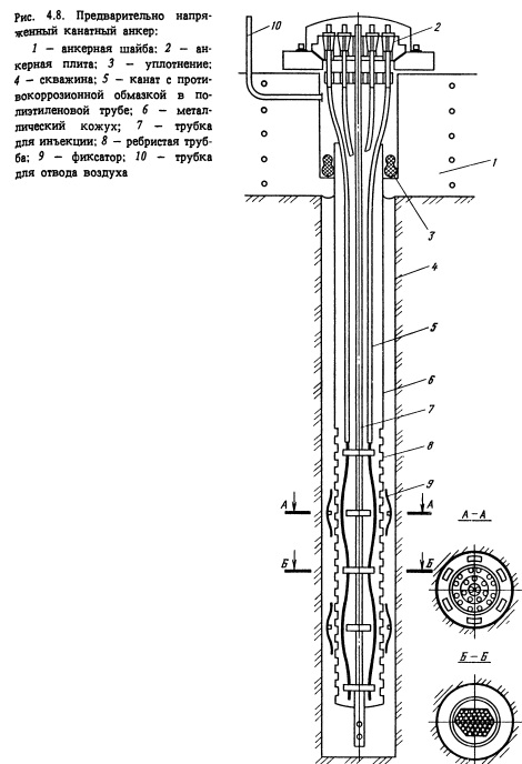 Обделки из набрызг-бетона и предварительно напряженных анкеров. Предварительно напряженные анкеры. Обычная анкерная крепь вступает в работу лишь после появления в скальном масссиве каких-либо деформаций. Крепь из предварительно напряженных анкеров уменьшает эти деформации, а главное - вовлекает породу в активную работу сразу же после натяжения анкеров. Такая крепь позволяет создать вокруг всей камерной выработки или ее части несущую обжатую породную зону, воспринимающую нагрузки от собственного веса и от веса вышележащей породы и препятствующую любым подвижкам породы в пределах области горного массива, примыкающей к выработке. Крепь из предварительно напряженных анкеров в качестве постоянной несущей конструкции в подземных сооружениях стали широко использовать последние 15-20 лет. Причем с каждым годом область применения этого прогрессивного типа крепи расширяется, и в настоящее время во всем мире практически все крупные камерные выработки (например, машинные залы ГЭС) крепят предварительно напряженными анкерами. Следует отметить, что такие анкеры являются постоянной конструкцией и не заменяют собой крепь из обычных коротких анкеров, которую устанавливают по мере разработки выработки. Разработаны многочисленные конструкции предварительно напряженных анкеров. Наиболее распространены анкеры из канатов (прядей из высокопрочных проволок) и из отдельных стержней. На рис. 4.8 изображена разработанная Гидропроектом характерная конструкция канатного (прядевого) анкера с несущей способностью более 1000 кН. Анкер устанавливается в скважину диаметром 105 мм и состоит из семипроволочных канатов (арматурных прядей), свитых из высокопрочных проволок диаметром по 5 мм класса В-И; диаметр каната 15 мм, разрывное усилие 220 кН. Анкер состоит из 5-10 канатов (несущая способность анкера определяется