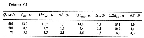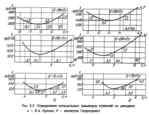 На рис. 6.3 в графической форме представлены результаты энергоэкономических расчетов по определению оптимальных диаметров туннелей трех размеров. Как видно из рисунка, изменение оптимального диаметра в сторону его уменьшения или увеличения приводит к возрастанию расчетных затрат. В табл. 6.5 приводится изменение расчетных затрат ЛЗ в зависимости от диаметра туннеля по отношению к расчетным затратам при экономически наивыгоднейшем диаметре с/эк, рассчитанном по методике Гидропроекта.