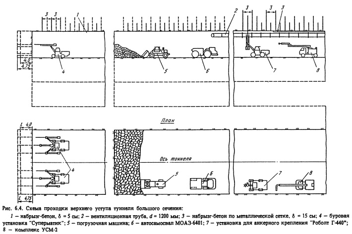 Гидроспецстрой разработал перечни рекомендуемых комплексов горнопроходческого оборудования, применение которых должно позволить существенно повысить темпы проходческих работ. Комплексы отечественного горнопроходческого оборудования ориентированы на следующее оборудование при многозабойном его использовании: для сечений до 20 м2 - буровое оборудование - установка БКГ-2; погрузочно-транспортное - машины ППН-3, ПНБ-2, погрузочнотранспортные машины ПТ-4, ПТ-5, вагоны ВПК-7, УВГ-2,5; вспомогательное оборудование - заряжание - ЗМК-1; нанесение набрызг- бетона - машины МНБ, БМ-70; бетонирование - ПБН-3; для сечений от 20 до 40 м2 - буровое оборудование - установки УБШ-322Д и УБШ-532Д; погрузочно-транспортное - машины ПНБ-ЗД, погрузочно-доставочные машины ПД-8, ПД-12, автосамосвалы МАЗ-503 и МОАЗ-6401; вспомогательное оборудование - установщик крепи УАГ-7, породооборщик ПОМ-ЮТ; нанесение набрызг-бетона - машины УСН-2 и БМ-70; бетонирование - МР-262, С-80; для сечений от 40 до 60 м2 - буровое оборудование - УБШ-532Д; погрузочно-транспортное - машины ПНБ-4, погрузочно-доставочные ПД-8, ПД-12, автосамосвалы МОАЗ-6401; вспомогательное оборудование - установщик крепи УАГ-7, породооборщик ПОМ-ЮТ; нанесение набрызг-бетона - машины УСН-2 и БМ-70; бетонирование - МР-263 и С-80; для сечений более 60 м2 - то же оборудование, кроме бурового, - наряду с установкой УБШ-532Д рекомендуются установка УБШ-662 и станок КБУ-80. Гидроспецстрой рекомендует также комплексы, составленные на базе лучшего иностранного оборудования, обеспечивающие темпы работ, достигнутые за рубежом. В отдельных случаях практикуются разработка и внедрение высокопроизводительной техники по кооперации с зарубежными фирмами. Например, в 1984 г. на строительстве Ташлыкской ГАЭС (Украина) была применена гидрофицированная установка СМГ-207, созданная на Можайском экспериментальном предприятии АФ Гидроспецстроя по кооперации с фирмой Тамрок (Финляндия), предоставившей гидравлические молотки. Эта установка позволила получить среднюю скорость проходки в 1984 г. 62,1 м/мес, а дальнейшее ее использование по многозабойной схеме обеспечило за 6 мес 1985 г. выполнение проходки подводящих водоводов длиной 696 м, сечением 52 м2 в крепких породах со средней скоростью 115,4 м/мес. Работу в области научного обоснования интенсивной технологии проходки проводит институт Оргэнергострой. Рассмотрим два вопроса повышения качества работ, по которым пока не найдены оптимальные решения: переборы профиля выработки (и связанные с этим переклады бетона в обделку) и качество бетонной поверхности обделок туннелей. Остальные вопросы качества работ имеют, как правило, местный характер и зависят лишь от квалификации персонала (строительного и эксплуатационного). ряде туннелей намного превышают эти значения, а последующее заполнение их бетоном или цементно-песчаным раствором приносит весьма значительные убытки. Технология контурного взрывания (по методу сближенных зарядов или путем предварительного щелеобразования) была разработана Гидроспецстроем совместно с Оргэнергостроем еще лет 25 назад и успешно применялась на ряде объектов (Нурекская, Токтогульская ГЭС). Но уже в то время стало ясно, что переборы вызваны двумя причинами: технологическими и геологическими, причем последние зависят не столько от коэффициента крепости, сколько от характера трещиноватости пород