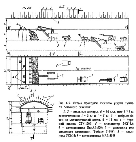 Таким образом, изменение расчетного диаметра туннеля в пределах -10 - +20%, в результате которого ускоряется пуск ГЭС в эксплуатацию, не должно оказать существенного влияния на энергоэкономические характеристики гидроэлектростанции. Механизированное оборудование эксплуатируется в породах различной прочности. Для каждой прочности пород диапазон диаметров туннелей можно разделить на три группы. Первая группа - это щиты и комбайны наружным диаметром около трех метров (ПК-8М, КЩ-3,2Б), вторая группа - диаметром около 5 метров (Союз-19, КЩ-5,2Б, КТ-1-5,6, АФП-1), третья группа - диаметром 8,5 м (КТ-8,5-2Д). Для крепких пород (более 80 МПа) разработано два комбайна (Союз-19 и АФП-1, который требует существенных доработок). Рассмотрим внутреннее сечение туннелей, полагая толщину обделки равной 0,2-0,15 м. В диапазоне изменения оптимального диаметра -10 - +20% оказывается, что первая группа машин для пород прочностью менее 80 МПа перекрывает внутренние диаметры туннеля от 2,3 до 3,6 м, вторая группа - от 4,2 до 6,2 м и, наконец, третья группа от 7,8 до 9,3 м. Для крепких пород (более 80 МПа) диапазон работы обоих комбайнов составляет от 3,8 до 6,4 м. Таким образом, туннели, имеющие оптимальные расчетные внутренние диаметры, находящиеся в пределах размеров каждой из этих групп, при указанных выше условиях можно проходить комбайнами или механизированными щитами перечисленных выше типов. Для пород прочностью до 80 МПа туннели с внутренними диаметрами от 3,6 до 4,2 м и от 6,2 до 7,8 м могут быть пройдены комбайнами или механическими щитами диаметром, обеспечивающим в диапазоне -10+- +20% внутренние диаметры туннелей 3,9 и 6,4 м. Для пород прочностью более 80 МПа - туннели с внутренними диаметрами от 2,9 до 3,8 м, от 6,2 до 7,8 м и от 7,8 до 9,6 м могут быть пройдены комбайнами, обеспечивающими внутренние диаметры туннелей соответственно 3,2; 6,4 и 8,2 м. Интенсивная технология проходки горным способом. Рассмотрим основные принципы интенсивной технологии строительства туннелейгорным способом на базе лучшего отечественного оборудования или использования отдельных машин, закупленных за рубежом. Интенсивная технология строительства горных транспортных туннелей. В 1985 г. ЦНИИС Минтрансстроя, Лен- метрогипротрансом и СКТБ Главтоннельметростроя разработаны 45 высокопроизводительных технологических схем сооружения туннелей и штолен. Технологические схемы сооружения однопутных железнодорожных туннелей в устойчивых породах рассчитаны на проходку сплошным забоем со скоростью 90 м/мес при использовании портальных буровых агрегатов (рам) для многомашинного обуривания забоя типа Фурукава (Япония), погрузочных машин ПНБ-ЗД, вагонов ВПК-10 или УВГ-2,5, а в случае сравнительно коротких забоев (до 1,5 км) - автопоездов МОАЗ-6401. В породах средней и ниже средней крепости рекомендуются способы нижнего уступа и опертого свода соответственно с применением арочного крепления, самоходных установок типа УБШ в ка- лотте и СБУ-70 в уступе (скорость проходки по калотте 75-80 м/мес). Реализация схем, предусматривающих применение передвижного металлического консольного моста, с помощью которого с одним и тем же оборудованием возможно организовывать работу как способом сплошного забоя, так и нижнего уступа, позволяет, по мнению авторов, достигать скорости проходки 120 и 100 м/мес соответственно. На участках неустойчивых пород может применяться 