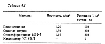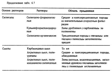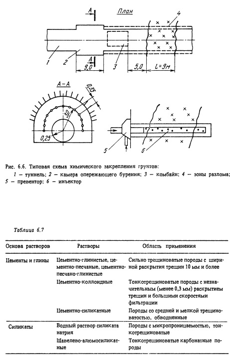 Цементы и глины Цементно-глинистые, цементно-песчаные, цементно-песчано-глинистые Цементно-коллоидные Цементно-силикатные Сильно трещиноватые породы с шириной раскрытия трещин 10 мм и более Тонкотрещиноватые породы с незначительным (менее 0,3 мм) раскрытием трещин и большими скоростями фильтрации Примерный состав раствора второй группы, принятый для стабилизации разломов, приведен в табл. 6.6. Типовая схема по химическому закреплению зоны разлома длиной 9 м в породах, содержащих до 25% глинистых частиц, показана на рис. 6.6. По аналогии со сводом из труб пробуривается один ряд скважин диаметром 86 мм в количестве 12 шт. Нагнетание ведется через манжетные колонны. На укрепление указанного разлома требуется примерно 1 мес. За рубежом (в Японии, Франции и других странах), а также на отдельных участках туннелей БАМа растворы применяют в сочетании с опережающим защитным экраном из труб, выполненным по периметру свода туннеля. Площадь поперечного сечения крупных камерных выработок достигает 1000 м2 и более.