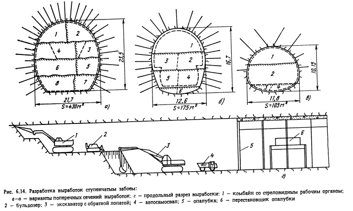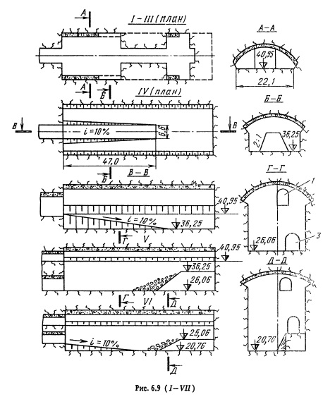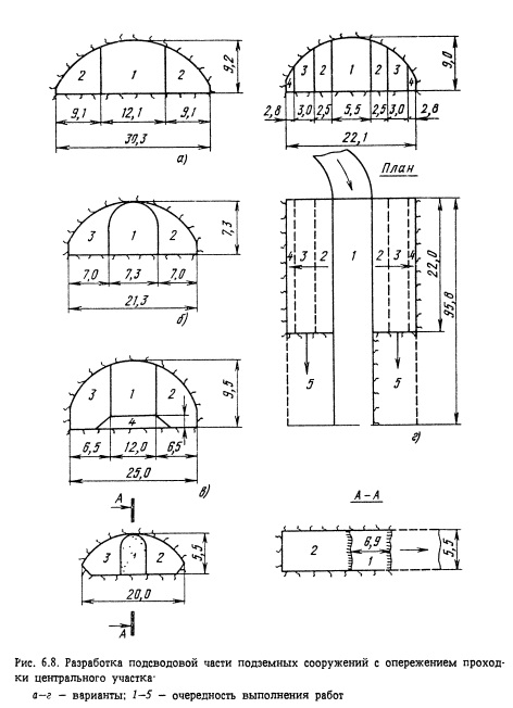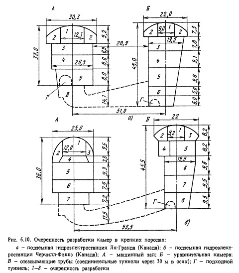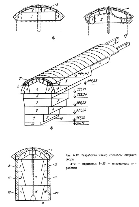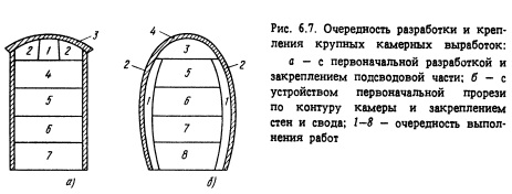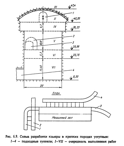 Подземные сооружения большого сечения камерного типа располагают преимущественно в крепких слаботрещиноватых скальных породах. При этом облегчается проходка и снижаются затраты на крепление. Тем не менее многочисленные крупные подземные сооружения приходится размещать ниже уровня подземных вод в породах трещиноватых, нарушенных, средней крепости и даже мягких. Строительство камер в подобных условиях является особо сложной инженерной задачей. Существенное различие в размерах крупных камерных подземных сооружений по сравнению с туннелями и горными выработками не всегда позволяет использовать обычно практикуемые способы проходки и крепления и требует применения иных методов и технологии строительства. Разработка крупных камерных выработок осуществляется двумя способами: разработка подсводовой части камеры, возведение обделки свода, затем разработка основного массива породы (ядра) и закрепление стен камеры (рис. 6.7, а). создание прорези по периметру камеры с закреплением стен и свода камеры, затем разработка основного массива породы (ядра) под защитой установленной обделки (рис. 6.7, б). Как правило, первый способ применяют при строительстве подземных сооружений, располагаемых в сравнительно крепких породах, а второй - в мягких породах и породах средней крепости или при значительных пролетах камерных выработок. Первый способ реализуется при уступной разработке крупных камерных выработок и разработке способом опертого свода, второй - при разработке способом опорного ядра. Имеются также отдельные модификации этих решений. Независимо от очередности выполнения работ при разработке камер следует руководствоваться главным принципом: до начала разработки очередного участка поперечного сечения камеры выше- расположенный участок должен быть надежно закреплен для обеспечения устойчивости сооружения и безопасности работающих в нем. Подземное сооружение камерного типа в процессе его строительства должно разрабатываться с минимальным нарушением вмещающего породного массива. Поэтому в этих условиях применение контурного взрывания является обязательным. Обычно в подсводовой части камеры используют метод сближенных зарядов (с взрыванием зарядов в контурных шпурах в последнюю очередь), а в уступах - метод предварительного щелеобразования (с взрыванием зарядов в скважинах по контуру строчки гладкого откола до начала взрывания зарядов в остальных скважинах). Разработку подземного сооружения удобнее всего производить с обеих торцовых сторон с тем, чтобы организовать работы вдоль оси камеры встречными забоями. Однако это не всегда удается по геологическим условиям и тогда приходится проходить вспомогательные подходные выработки и примыкать их в различных местах сооружения (к торцам или к средней части по длине камеры). Подходные выработки к подземным сооружениям камерного типа по своему назначению делятся на постоянные (эксплуатационные) и временные (строительные). При решении вопросов выбора типа и числа подходов следует иметь в виду, что каждое крупное камерное сооружение имеет определенное число подходов, обеспечивающих нормальную эксплуатацию этого сооружения. Для условий строительства в первую очередь проверяется, можно ли ограничиться только этими выработками, т.е. использовать эксплуатационные по