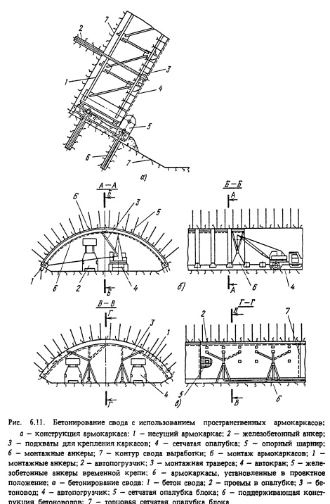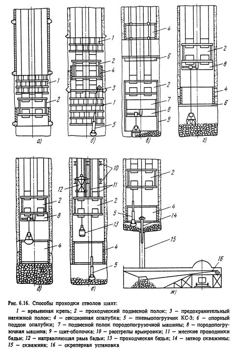 Основным недостатком данной схемы являются большая продолжительность работ и частые нарушения временной крепи в призабойной зоне взрывными работами. Параллельная схема проходки ствола (рис. 6.16,6) предусматривает ведение работ по выемке грунта и возведению обделки одновременно на двух смежных участках по высоте ствола. На нижнем участке выполняются работы по выемке грунта и возведению временной крепи под защитой предохранительного полка, а на верхнем участке с проходческого полка возводится постоянная обделка. Средняя скорость проходки стволов в 2-2,5 раза выше, чем при последовательной схеме. Недостатками этой схемы являются: повышенная сложность и опасность работ; дополнительное перекрытие ствола предохранительным полком, усложняющее работу подъема; применение большого количества лебедок, канатов и подвесного оборудования. Схема применяется для стволов большого диаметра и значительной глубины. Параллельно-щитовая схема проходки ствола (рис. 6.16, в). Монолитную бетонную обделку возводят на расстоянии около 30 м от забоя в направлении сверху вниз с применением передвижной опалубки и опорного поддона. На незакрепленном участке ствола вместо временной крепи размещают металлический щит-оболочку. Опалубка и опорный поддон имеют самостоятельные канатные подвески. Щит-оболочка подвешивается в стволе свободно и предназначается только для обеспечения безопасности работающих в забое. Операции по выемке породы и бетонированию обделки не совмещаются только при ведении взрывных работ в забое и перемещении проходческого оборудования. К недостаткам этой схемы относятся большие капитальные затраты на оснащение ствола и возможность использования щита-оболочки только в устойчивых грунтах. При применении этой схемы на шахтах Донбасса были достигнуты рекордные скорости: 290,5; 390,1 и 401,3 м/мес. Совмещенная схема сооружения ствола предусматривает выполнение операций по выемке грунта и возведению обделки в едином проходческом цикле. В этом случае обделка может быть монолитная бетонная или из сборных элементов (тюбинговая). Совмещенная схема исключает применение временной крепи и при монолитной бетонной обделке - опорных венцов. Работы по выемке породы и возведению обделки могут выполняться параллельно или последовательно. При параллельном выполнении работ (рис. 6.16, г) обделка возводится на небольшом удалении от забоя. В этом случае применяют секционную опалубку с опорным поддоном. При последовательном выполнении работ по выемке грунта и возведению монолитной бетонной обделки (рис. 6.16, д, е) опалубка устанавливается на выровненную взорванную породу. Данная схема создает возможность некоторого совмещения операций по укладке бетонной смеси и погрузке породы. После укладки быстротвердеющей бетонной смеси по всему периметру ствола на высоту около 1 м из центральной части забоя начинают погрузку породы. Остальную часть породы грузят после набора бетоном прочности 0,8 МПа. Основной недостаток схемы - нахождение бетонной обделки и опалубки в непосредственной близости от забоя, что стесняет рабочее пространство и затрудняет применение контурного взрывания с использованием бурильных установок. Применение сборной тюбинговой обделки исключает этот недостаток. Проходка стволов малым сечением (4-6 м2) снизу вверх с последующим его 