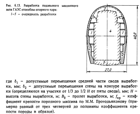 Теоретически с требуемой точностью предсказать возможные перемещения массива по глубине и по контуру выработки методом конечных элементом не удается из-за сложности получения точных исходных данных с учетом фактического напряженного состояния, неоднородности и анизотропии горного массива, окружающего подземное сооружение. Исходя из этих обстоятельств для обеспечения безопасности работ по строительству камеры и надежной ее эксплуатации проведение натурных наблюдений является обязательным условием создания крупных подземных сооружений (подземных машинных залой ГЭС и ГАЭС). В комплекс гидротехнических сооружений во многих случаях входят вертикальные и наклонные подземные сооружения или части сооружений. К ним можно отнести подземные части вертикальных и наклонных турбинных водоводов, вертикальных уравнительных резервуаров, а также различные грузоподъемные и вспомогательные шахты. Очень часто такие выработки называют шахтами. Однако это неточно, так как под термином шахта в горнодобывающей промышленности обычно понимают не вертикальную горную выработку, а самостоятельное горнодобывающее предприятие, имеющее целью добычу полезного ископаемого подземным способом в пределах отведенной для нее части месторождения. В данном разделе рассматриваются способы сооружения только вертикальной и наклонной частей упомянутых выше гидротехнических сооружений или шахт, которые принято называть стволом шахты. Способы проходки вертикальных шахт. Способы проходки шахт обуславливаются главным образом геологическими и гидрогеологическими условиями залегания горных пород. В зависимости от устойчивости пород и их водообильности различают обычные и специальные способы проходки. Обычные способы применяются при проходке в устойчивых и маловодоносных породах, когда вода из забоя может быть удалена на поверхность при помощи подъемных сосудов или насосов, а стенки ствола остаются устойчивыми при их закреплении временной крепью на период до возведения постоянной крепи. Специальные способы применяются в неустойчивых, рыхлых и плывучих породах или устойчивых, но сильно трещиноватых и водоносных породах, когда приток воды в забой достигает 20 м3/ч и выше (в данной книге не рассматриваются). Формы и размеры сечения стволов шахт прежде всего определяются их назначением, а также зависят от способа проходки и крепления. Основными формами поперечного сечения вертикальных стволов являются прямоугольная и круглая. Прямоугольная форма применяется в стволах, сравнительно неглубоких (до 100-120 м), преимущественно для кабельных, лифтовых и других вспомогательных шахт, расположенных в устойчивых грунтах. Размеры сечения стволов определяются размерами оборудования и коммуникаций, в них расположенных. В стволах гидротехнических шахт (турбинных водоводов, уравнительных резервуаров), а также грузоподъемных, вентиляционных и других в основном применяется круглая форма. Размеры сечения (диаметр) стволов гидротехнических шахт определяются гидравлическими расчетами, а грузоподъемных и других - располагаемым в них оборудованием. Стволы шахт турбинных водоводов, шинных, кабельных, грузовых и других обычно имеют диаметры от 4 до 9 м. Технология проходки таких шахт достаточно освоена многолетней практикой во всех отраслях промышленности