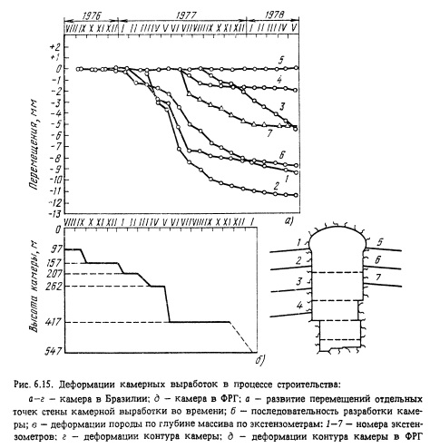 При превышении допустимых значений перемещений в натуре следует проанализировать их изменение во времени и при необходимости установить дополнительную крепь. Характер изменения деформаций во времени, по глубине массива, а также перемещение всего контура выработки покажем на примере подземного машинного зала ГЭС Паоло Афонсо-IV (Бразилия), схема крепления которого приведена на рис. 6.15. Кривые перемещения (рис. 6.15, о) вполне характерны для большинства крупных подземных сооружений. Основная часть перемещений стен происходит в процессе разработки ядра камеры, затем эти перемещения постепенно уменьшаются. Обычно процесс стабилизации перемещений продолжается около года и более. Перемещения отдельных точек по глубине массива (рис. 6.15, в) фиксируются экстензометрами. Из рисунка видно, что влиянию разработки камеры в наибольшей степени подвержена зона глубиной 10 м от контура. Это определило длину предварительно напряженных анкеров, а в отдельных местах потребовало усиления крепления. Например, как следует из рис. 6.15, а, точка 2 не имеет тенденции к стабилизации и имеет постоянное смещение, равное 0,7 мм/мес.