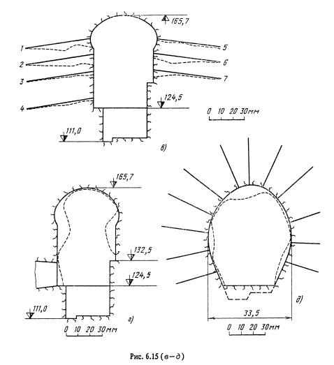 Перемещения контура подземных сооружений больших размеров, размещаемых в скальных породах, незначительны. В нормальных условиях влияние разгрузки массива и перераспределение напряжений проявляются в виде малых перемещений контура, измеряемых в миллиметрах. Свод контура выработки перемещается вниз на значение, редко превышающее 30 мм, а стены сближаются обычно не более чем на 50 мм. Однако в ряде случаев перемещения стен достигают 20-30 см (Колымская, Рогунская ГЭС). ![]()