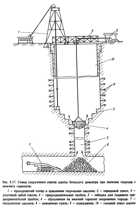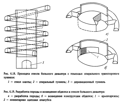 Сооружение таких наклонных стволов может осуществляться как сверху вниз полным сечением с подъемом взорванной породы наверх, так и снизу вверх одной или двух выработок с последующим расширением выработки до полного проектного сечения сверху вниз. Первый из этих способов может быть рекомендован в слабых грунтах, склонных к обрушению при их вскрытии и требующих немедленного их закрепления, а также в тех случаях, когда отсутствует возможность организации транспортного подхода к нижней части наклонного ствола.