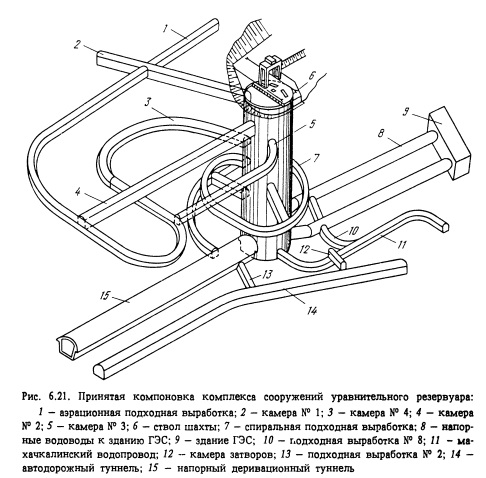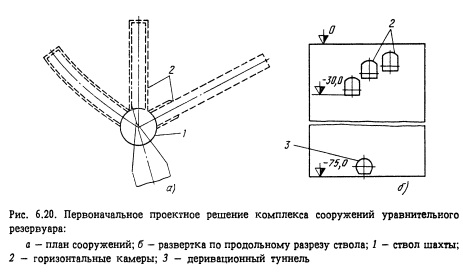 При рассмотрении возможных схем группой специалистов института Гидроспецпроект было предложено решение, принципиальной основой которого являлась проходка спирального транспортного туннеля вокруг ствола шахты на всю его высоту (рис. 6.18). Спиральный туннель при этом имеет соединительные выработки со стволом через каждые 6-7 м по высоте. Такое решение позволяет осуществить проходку ствола большого диаметра высокопроизводительным оборудованием, при этом разработка породы и возведение обделки ведется аналогично проходке нижнего уступа туннелей большого сечения (рис. 6.19). Этот способ был успешно применен при сооружении ствола уравнительного резервуара Миатлинской ГЭС, который первоначально состоял из шахты диаметром 25 м, глубиной 75 м и трех горизонтальных подземных камер верхнего расположения сечением более 100 м2 каждая и общей протяженностью 350 м (рис. 6.20).
