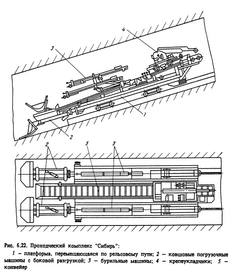 Способы проходки наклонных шахт Гидротехнические сооружения имеют наклонные участки подводящих туннельных водоводов и строительно-эксплуатационных туннельных водосбросов, а также отдельные наклонные участки других сооружений (отсасывающих труб ГЭС, шинных шахт и др.). Кроме того, в некоторых случаях в качестве строительного подхода на отметку того или иного глубоко расположенного подземного сооружения могут создаваться наклонные грузоподъемные шахты, предназначенные для выдачи горной породы на дневную поверхность, доставки в подземные выработки материалов и оборудования, а также подъема и спуска людей. Выбор способа сооружения наклонных стволов и других наклонных выработок, а также подбор необходимого горнопроходческого оборудованйя зависят от угла их наклона к горизонту, размеров поперечного сечения и инженерно-геологических условий. В зависимости от угла наклона к горизонту выработки подразделяются на слабонаклонные с углом наклона до 15, средненаклонные от 15 до 30 е и крутонаклонные свыше 30е. При проходке слабонаклонных выработок буровзрывным способом могут применяться те же типы погрузочных машин и буровой техники, что и при проходке горизонтальных выработок. Транспортирование породы независимо от выбранного способа проходки может осуществляться в вагонетках на канатной тяге маневровыми лебедками, конвейерами различных типов, а при значительных сечениях выработок - самоходными вагонами, думперами и автосамосвалами. Всредненаклонных выработках сечением до 30м2 применяются скреперные установки и скиповый подъем грунта. Скреперные установки в сочетании с конвейерным транспортом могут быть рекомендованы при углах наклона выработки до 18 е. При больших углах наклона породу следует транспортировать в вагонетках или скипах с помощью канатной тяги. На строительстве Вилюйской и Усть-Хантайской ГЭС при сооружении в направлении снизу вверх направляющей штольни сечением 6 м2 в отсасывающих трубах с углом наклона до 28 е применялись скреперные установки вместимостью ковша от 0,2 до 0,5 м3. Для транспортирования взорванной породы на нижний горизонт скреперный полок размещался на эстакаде. Дальнейшее расширение выработок до проектного профиля осуществлялось в направлении сверху вниз. КузНИИшахтостроем для сооружения наклонных выработок (стволов) разработан проходческий комплекс Сибирь (рис. 6.22). Комплекс выполняет все основные горные работы при сооружении наклонных стволов с углом наклона от 8 до 25 е - бурение шпуров, погрузку породы из забоя на конвейер или в скип и крепление выработки.