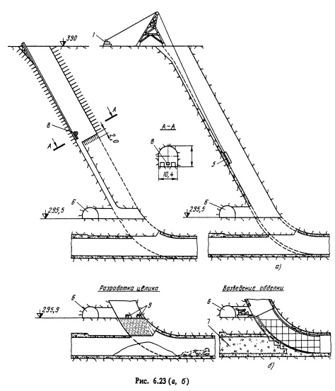 При этом способе облегчается бурение и установка временной крепи, однако усложняется уборка грунта. Подобная схема была применена на строительстве напорных водоводов Ингурской ГЭС, где был применен проходческий агрегат, позволивший выполнять в комплексе работы по бурению и уборке взорванной породы. Способ сооружения наклонных стволов с помощью восстающих выработок, пройденных снизу вверх и последующим их расширением сверху вниз до проектных размеров является наиболее производительным и эффективным. Проходка восстающих выработок снизу вверх при угле наклона более 40 е выполняется с использованием самоходных полков (типа Алимак, КПВ и др.). При этом способе как при проходке восстающих выработок, так и при их расширении до проектных размеров взорванная порода падает вниз на горизонт откатки, где мощными погрузочными машинами погружается в автосамосвалы и вывозится в отвал. При этом способе отпадает самая трудоемкая операция - погрузка грунта в забое наклонной шахты и подъем его на поверхность. Принципиальная схема сооружения наклонного ствола шахты строительно-эксплуатационного водосброса с помощью восстающих выработок и последующего их расширения до проектных размеров ствола шахты приведена на рис. 6.23.