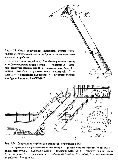 Наибольшую сложность представляет сооружение крутонаклонных выработок (наклонных стволов шахт), к которым относятся наклонные участки туннельных водоводов ГЭС и эксплуатационных водосбросов, площадь сечения которых обычно составляет от 25 до 130 м2, а на некоторых проектируемых перспективных ГЭС и более. Угол наклона таких стволов обычно составляет от 30 до 60 е.