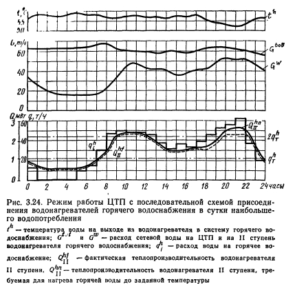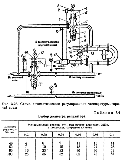 АВТОМАТИЧЕСКОЕ РЕГУЛИРОВАНИЕ НАГРЕВА ГОРЯЧЕЙ ВОДЫ В ВОДОНАГРЕВАТЕЛЯХЗадачей автоматического регулирования является поддержание постоянной заданной температуры воды на выходе из водонагревателя независимо от изменения температуры греющей воды и интенсивности водоразбора. Обычно такое регулирование осуществляется с использованием гидравлических и электронных регуляторов изменением количества греющей воды. В Москве наиболее широкое распространение получили гидравлические регуляторы температуры воды прямого действия. Регулятор температуры воды конструкции Теплосети Мосэнерго состоит из регулятора прямого действия типа РР (регулирующий клапан) и биметаллического реле типа ТРБ-2. Регулятор работает под действием давления воды из тепловой сети или из водопровода. Более стабильное давление обычно имеется в подающем трубопроводе тепловой сети. В этом случае отбор воды обычно производится до регулирующего клапана. На рис. 3.23 приведена типовая схема установки регулятора температуры, применяемая в Теплосети Мосэнерго. Регулятор состоит из корпуса 1 с двумя крышками, однощельного клапана 6, соединенного штоком 5 с донником сильфона 4У и пружины 7 с натяжным приспособлением 5. Площадь сильфона примерно равна расчетной площади клапана, поэтому на него не воздействует давление воды перед регулятором. Давление воды после регулятора создает усилие на клапан, которое стремится поднять его вверх. Этому усилию противодействуют пружина 7 и давление, оказываемое рабочей жидкостью на сильфон. При максимальном давлении воды на сильфон клапан открыт, при сообщении надсильфонной камеры с атмосферным давлением — клапан закрыт. Для увеличения или уменьшения расхода воды через клапан при установившихся давлениях за клапаном и действующих на сильфон, натягивают или ослабляют пружину, вращая натяжное приспособление соответственно по часовой стрелке или против часовой стрелки. Диаметр исполнительно-регулирующего устройства регулятора выбирают в зависимости от максимального расхода сетевой воды и допустимой потери давления в полностью открытом клапане по табл. 3.4. ![]() Допустимые потери давления в клапане определяют в зависимости от разности напоров на тепловом пункте и схемы включения водонагревателя. Минимальные допустимые потери давления характерны для двухступенчатой последовательной схемы включения водонагревателей, максимальные — для параллельной и двухступенчатой смешанной схем. Если двухступенчатая установка горячего водоснабжения может работать как по последовательной, так и по смешанной схеме, то диаметр регуляторов выбирают из расчета их работы по последовательной схеме, т. е. на меньшую потерю давления в регулирующем клапане. Пример 6. Двухступенчатый воднагреватель горячего водоснабжения включен по последовательной схеме. Максимум расхода сетевой воды на горячее водоснабжение составляет 20т/ч, при этом потери давления в водонагревателе равны 0,04 МПа. Действительный перепад давлений на тепловом пункте 0,26 МПа, требуемый перепад перед элеватором 0,2 МПа. Допустимые потери давления в клапане 0,26—0,2—0,04 =0,02 МПа. По табл. 3.4 выбираем регулятор РР-80. Реле ТРБ-2 (см. рис. 3.23) состоит из пучка биметаллических пластин 13, вставленных в герметическую латунную гильзу, которую помещают в поток нагреваемой воды. Одним конц