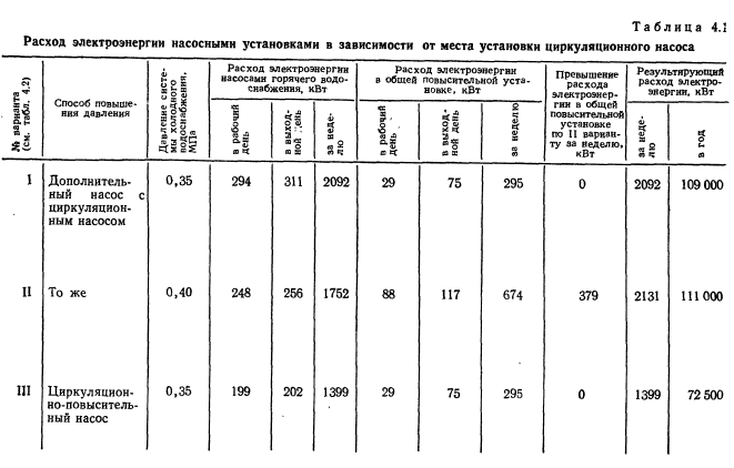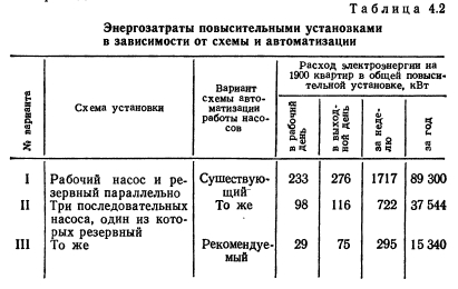 ЭКОНОМИЧЕСКАЯ ОЦЕНКА СХЕМ НАСОСНЫХ УСТАНОВОК И ИХ АВТОМАТИЗАЦИЯЭкономическая оценка схем насосных установок и схем автоматизации производилась на математической модели жилого микрорайона, обслуживающего 1900 квартир 9-этажных зданий, при этом системы холодного и горячего водоснабжения кварталов оставались неизменными, но оборудовались различными схемами насосных установок и автоматики. Давление в городском водопроводе в течение суток принято изменяющимся от 0,33 до 0,42 МПа. Требуемое давление при расчетном водоразборе перед наиболее удаленным узлом системы холодного водоснабжения 0,35-0,4 МПа. Первым этапом было сравнение способов дополнительного повышения давления в системе горячего водоснабжения. Сравнение проводилось при одинаковой схеме общей повысительной установки, которая поддерживала давление перед I ступенью водонагревателя таким, чтобы обеспечивалось постоянное необходимое давление в конце системы холодного водоснабжения (0,33МПа). В одном из вариантов оно было увеличено до 0,4 МПа. Общая повысительная установка состояла из последовательно соединенных насосов, автоматизированных по схеме на рис. 4.8. Сравнивались варианты установки в системе горячего водоснабжения циркуляционно-повысительного насоса и дополнительного повысительного насоса в сочетании с циркуляционным насосом. Дополнительный насос автоматизировался по рекомендуемой схеме. Результаты сравнения приведены в табл. 4.1. Дополнительный насос в I варианте работал круглосуточно, поэтому автоматизация в этих условиях нецелесообразна. Увеличение давления, поддерживаемого общей повысительной установкой (II вариант), сократило расход электроэнергии дополнительным насосом. Однако расход электроэнергии общей повысительной установки увеличился в большей степени. Применение повысительного насоса (III вариант) дополнительного с циркуляционным позволило уменьшить расход электроэнергии насосами горячего водоснабжения в 1,5 раза, или 19210 кВт/год на 1000 квартир. Результаты сравнения расхода электроэнергии и общей повысительной установке в зависимости от схемы установки насосов и схемы автоматизации их работы приведены в табл. 4.2. ![]() ![]() Как видно, переход на последовательную схему при существующей схеме автоматизации работы насосов позволяет сократить расход электроэнергии в 2,4 раза, при усовершенствованной схеме автоматизации — в 5,6 раза. |