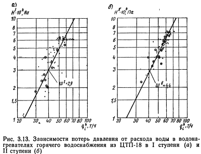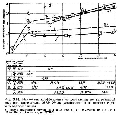 ИЗМЕНЕНИЕ СОПРОТИВЛЕНИЯ ВОДОНАГРЕВАТЕЛЕЙ ПО НАГРЕВАЕМОЙ ВОДЕПроследим, как меняется сопротивление водонагревателей в процессе эксплуатации. Коэффициент сопротивления водонагревателей ke вычислялся по формуле ![]() В каждой серии испытаний этот коэффициент определялся по результатам нескольких измерений (рис. 3.13). Проводились одномоментные (обозначены кружочком) и выборочные по результатам обработки десятиминуток (обозначены точками) измерения. Графики, приведенные на рисунке, свидетельствуют о хорошей сходимости результатов по обоим методам обработки. Коэффициент сопротивления скоростных водонагревателей горячего водоснабжения типа МВН при прохождении воды по трубному пространству следует принимать для водонагревателей длиной 4 м, находящихся в эксплуатации, 0,75. Фактическое сопротивление водонагревателей перед ежегодной чисткой оказалось значительно выше расчетных значений. Так, при испытании водонагревателей горячего водоснабжения типа МВН № 37 в 1972 г. в ЦТП-12 фактический коэффициент сопротивления составил для I ступени 4,4; для II — 5,3. При испытании водонагревателей той же марки в 1974 г. в ЦТП-18 фактический коэффициент сопротивления составил соответственно для I и II ступени 2,9 и 4,4 (см. рис. 3.13). В ЦТП-2 коэффициент сопротивления для II ступени спустя 9 мес после чистки 1974 г. был равен 3,8. Значительное превышение фактических значений коэффициента сопротивления над расчетным было подтверждено также испытаниями МосжилНИИпроекта и Моспроекта-1. ![]() Как показало обследование, увеличение коэффициента сопротивления водонагревателей связано с интенсивным зарастанием трубных решеток отложениями коррозионного характера. Сплошные отложения на перемычках между трубками распространяются после смыкания на сечение трубок. Имеются решетки, где полным сечением работают только 5—6 трубок из 151. Калачи также покрыты значительными коррозионными отложениями высотой 10—20 мм. Отложения по длине трубок, как правило, невелики. Они представляют собой налет толщиной 0,3—0,5 мм, образующийся за счет выноса окислов железа из калачей. Анализ состава отложений показывает, что основой отложений (более чем на 3Д) являются окислы железа. Причиной интенсивных отложений является высокая коррозионность исходной водопроводной воды. Химическая водоподготовка в ЦТП Москвы не проводится, за исключением централизованного известкования на станции. Снижение потерь напора в водонагревателях достигается периодической (один раз в год) чисткой трубных решеток, трубок и калачей механическим способом. В последнее время применяют и чистку химическим способом — промывкой слабым раствором кислоты. Однако такие решения не позволяют снизить темп нарастания потерь напора и воздействовать на механизм процесса образования отложений. ![]() На рис. 3.14 показаны изменения коэффициента сопротивления водонагревателей после чисток по результатам шести серий испытаний на трех ЦТП. Режим эксплуатации ЦТП стандартный, температура горячей роды на выходе из водонагревателя 55—65 °С. Более полно представлены результаты испытаний 1974 г. после опытной чистки водонагревателей химическим методом (длительность испытаний около полугода) и 1975—1976 гг. на ЦТП-18 и ЦТП-2 (чистка выполнена механическим методом перед началом отопительного сезона). Анализ результатов испытаний показ