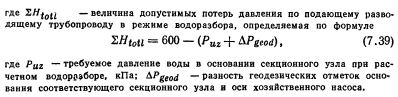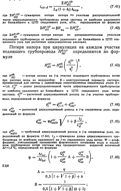 КОНСТРУИРОВАНИЕ И РАСЧЕТ КВАРТАЛЬНЫХ СИСТЕМ ГОРЯЧЕГО ВОДОСНАБЖЕНИЯДля каждой ветви системы определяется параметр А из формулы ![]() ![]() Для каждой ветви системы выбирается наибольшая величина (Puz+APgeoa) Ветвь системы, для которой параметр «А» минимален, является при расчете подающего трубопровода главной расчетной ветвью. Выбор диаметров подающих трубопроводов главной расчетной ветви производится при условии 100 кПа по величинам qhcir, определяемым в соответствии с ш 8.1. СНиПа и «i», определяемым по формуле ![]() Для условий Москвы (районы, снабжаемые волжской водой) рекомендуется принимать для подающего трубопровода квартальной сети kexp = 5, для циркуляционного трубопровода ехр—2,5. Для остальных городов величину kexp следует принимать по данным натурных замеров. При отсутствии этих данных и качестве водопроводной воды, сходной с водой московского водопровода, допускается принимать ?ехр=5 (2.5). Выбор диаметров подающих трубопроводов главной расчетной ветви при 2оа>100 кПа производится по величинам из условия обеспечения равенства потерь давления в холодном и горячем водопроводе. При этом суммарные потери напора по главной расчетной ветви не должны превышать величины Выбор диаметров подающих трубопроводов остальных ветвей системы производится из условия гашения в подающем трубопроводе ветви потерь напора равных потерям напора в главной расчетной ветви от наиболее удаленного секционного узла до точки присоединения к ней рассчитываемой ветви при расходах qhclr. Выбор диаметров циркуляционных трубопроводов квартальной сети следует начинать с распределительной части ветви системы с наибольшим числом присоединенных узлов по величинам расчетных циркуляционных расходов qcir и удельных потерь напора, определяемых из формулы ![]() ![]() При проектировании в системе горячего водоснабжения циркуляционного насоса на циркуляционном трубопроводе выбор диаметров участков циркуляционных трубопроводов головной части рассчитываемой ветви с наибольшим числом присоединенных секционных узлов предварительно производится по величинам расчетных циркуляционных расходов расчетной ветви и боковых ответвлений, присоединенных к соответствующим участкам, и удельных потерь напора, равным удельным потерям в распределительной части ветви системы При этом расчетные циркуляционные расходы по боковым ответвлениям определяются с величиной разрегулировки, принятой для основной ветви. После выбора циркуляционного насоса производится уточнение диаметров циркуляционных трубопроводов головной части рассчитываемой ветви системы из условия полного гашения имеющегося напора насоса. Величина icir вычисляется по формуле ![]() При проектировании в системе горячего водоснабжения циркуляционно-повысительного насоса на подающем трубопроводе выбор диаметров головной части рассчитываемой ветви системы производится однократно. Диаметры распределительной части циркуляционных трубопроводов боковых ответвлений, присоединяемых к головным участкам основной расчетной ветви, выбираются в соответствии с рекомендациями, при этом коэффициент р для боковых ответвлений принимается такой же величины, как и для основной расчетной ветви. Удельные потери напора в головных участках циркуляционного трубопровода бокового ответвления вычисляются по формуле ![]() Мето